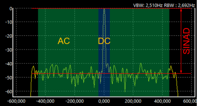 Eine Anwendung der DC/AC Aufteilung in RMS-Werten ist die einfache direkte Bestimmung der SINAD, sofern ein einzelner Ton mit Hintergrundrauschen vorliegt. Vorgehensweise: Verwendung eines zentrischen Filters (AM/FM/CW), Abstimmung auf den Ton (siehe Bild), setzen des AC Part als Referenzwert durch anklicken. Der SINAD-Wert kann dann direkt als DC Part abgelesen weren. Zu beachten ist hier, dass RMS-Werte verglichen werden (nicht Pegel im Spektrum) und wie bei allen Rauschmessungen die Filterbreite eine Rolle spielt (siehe Artikel dazu von Werner Schnorrenberg, DC4KU).