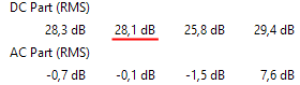 Effective (RMS): Effektivwert (True RMS) des SignalsRectified (ARV): Gleichrichtmittelwert (True ARV) des Signals. Formfaktor $F = \frac{10 ^ {RMS/20}}{10 ^ {ARV/20}}$Peak High: Maximaler Pegel im SpektrumPeak Low: Pegel des 5ten Quantils im Spektrum (Abschätzung des mittleren Rauschpegels)DC Part (RMS): Effektivwert des DC-Anteils (<10Hz) der ZFAC Part (RMS): Effektivwert des AC-Anteils (>10Hz) der ZF